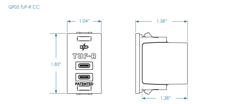 QF05 TUF-R® CC / 150W represents OE’s latest evolution in TUF USB charging. This cutting-edge, modular USB component features two advanced USB-C charging ports, enabling simultaneous high-power charging for up to two laptops or other USB-C powered devices.