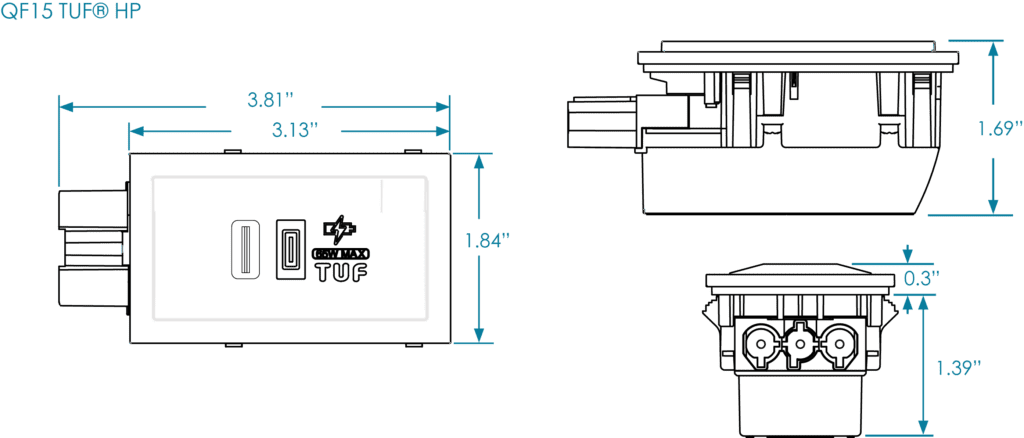 QF15 TUF HP is the latest product in a line of high-power USB options from OE. With a maximum output of 65 Watts, QF15 TUF HP powers laptops up to 65W through the USB-C port while allowing phone and tablet fast charging via the USB-A port.