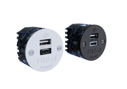OE’s TUF-R® is a patented USB fast charging module offering USB types A and C in a compact 42mm round fascia. TUF-R is the OE Electrics brand name for its Twin USB Fast – Replaceable charging module able to be fitted into the majority of OE power modules.